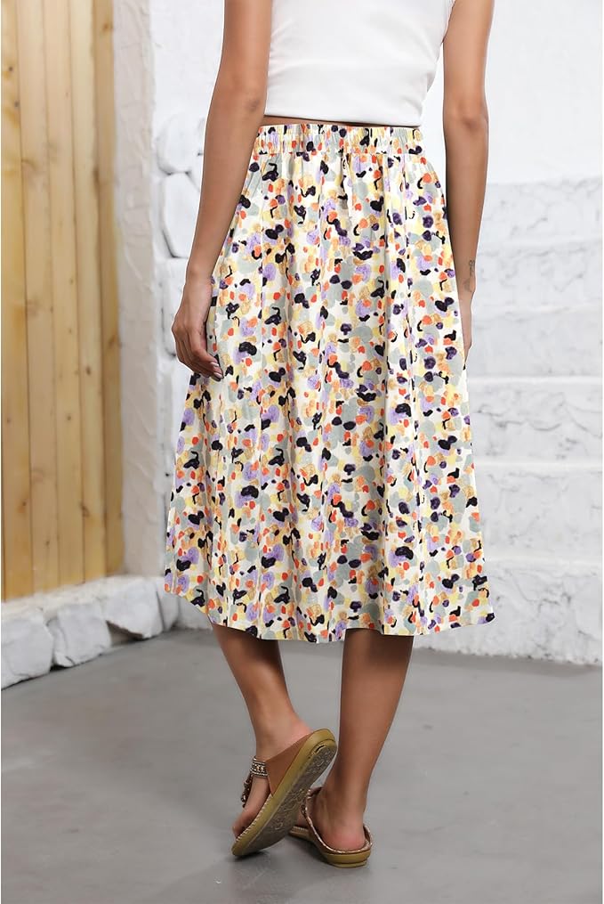 Flowy Skirt Midi Length Elastic High Waist A-Line Skirt with Pockets Bohemia for Women 2024 Trendy(S-2XL)