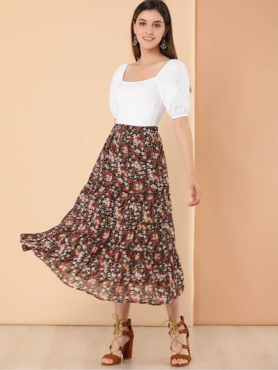 Women's Floral Skirts Chiffon A-line Long Tiered Ruffle Boho Midi Skirt XS-3XL