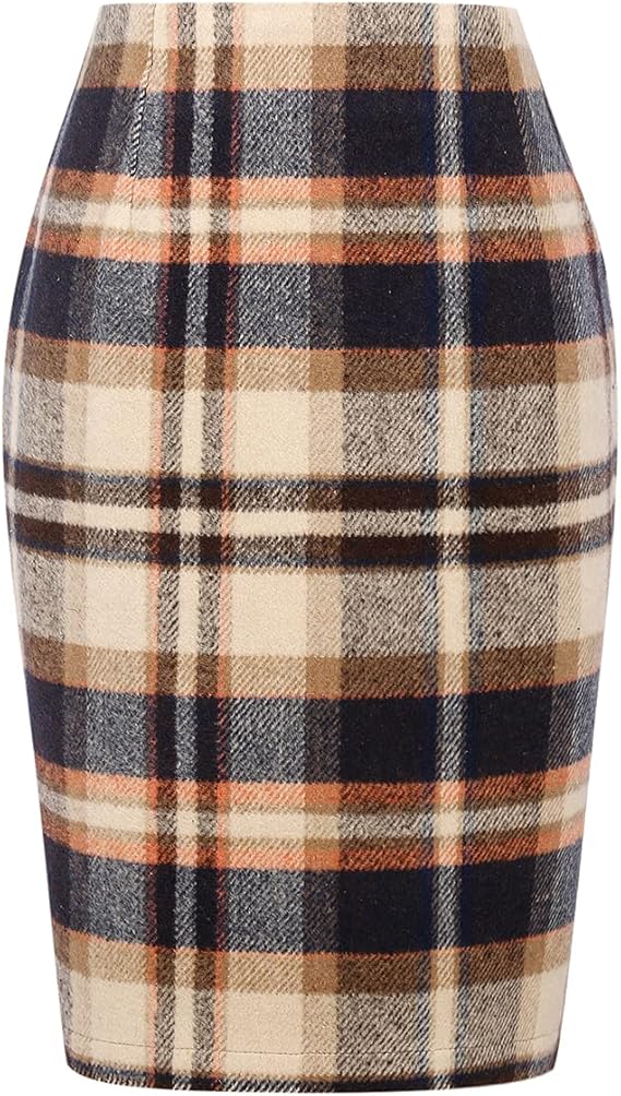 Midi Plaid Skirts for Women 2024 Fall Winter Knee Length Pencil Wool Skirt with Slit