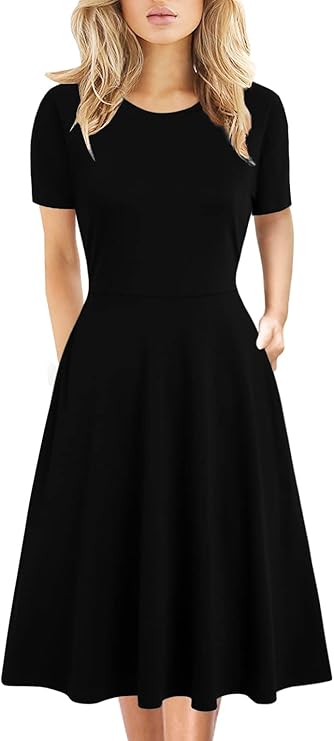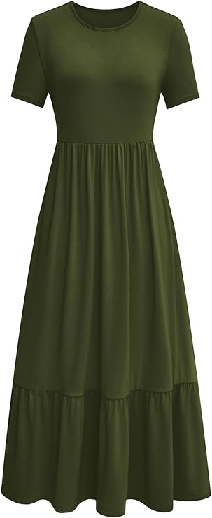 Womens Short Sleeve Crew Neck Tiered Flowy Swing Midi Dresses with Pockets