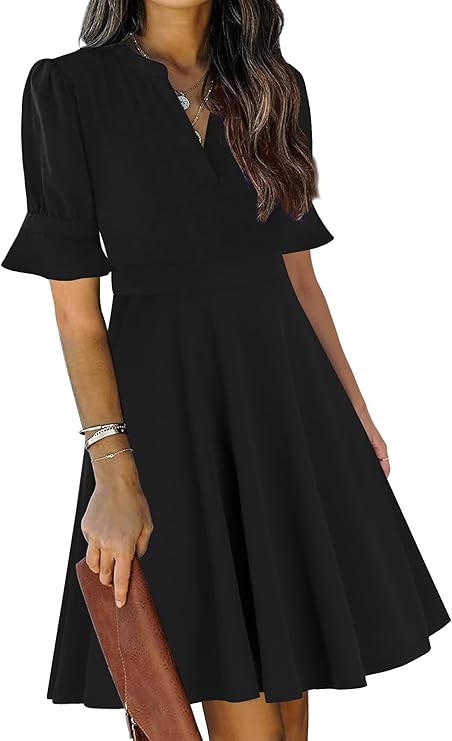 Shift Dress for Women V Neck Short Sleeves Solid Color Casual Flowy Summer Dresses(S-2XL)