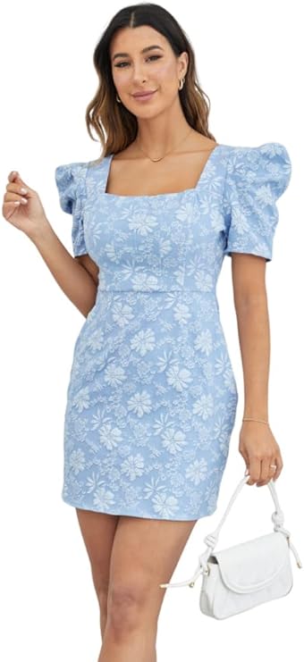 Women's Floral Square Neck Puff Short Sleeve Mini Dress High Waist Summer Boho Short Dresses
