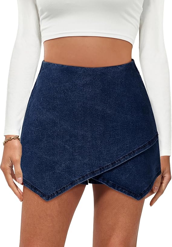 Jean Skorts for Woman High Waisted Pull On Stretchy Denim Wrap Skirt with Shorts Trendy Asymmetrical Skort